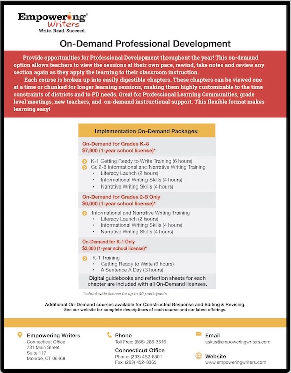 For the past 25 years, Empowering Writers has transformed K-8 writing instruction by providing teachers with the necessary knowledge, tools and skills to teach writing successfully. We’ve taught over 100,000 teachers how to improve student writing. Additionally, we continue to adapt our approach and teacher support to meet the changing needs in your classrooms and school districts.