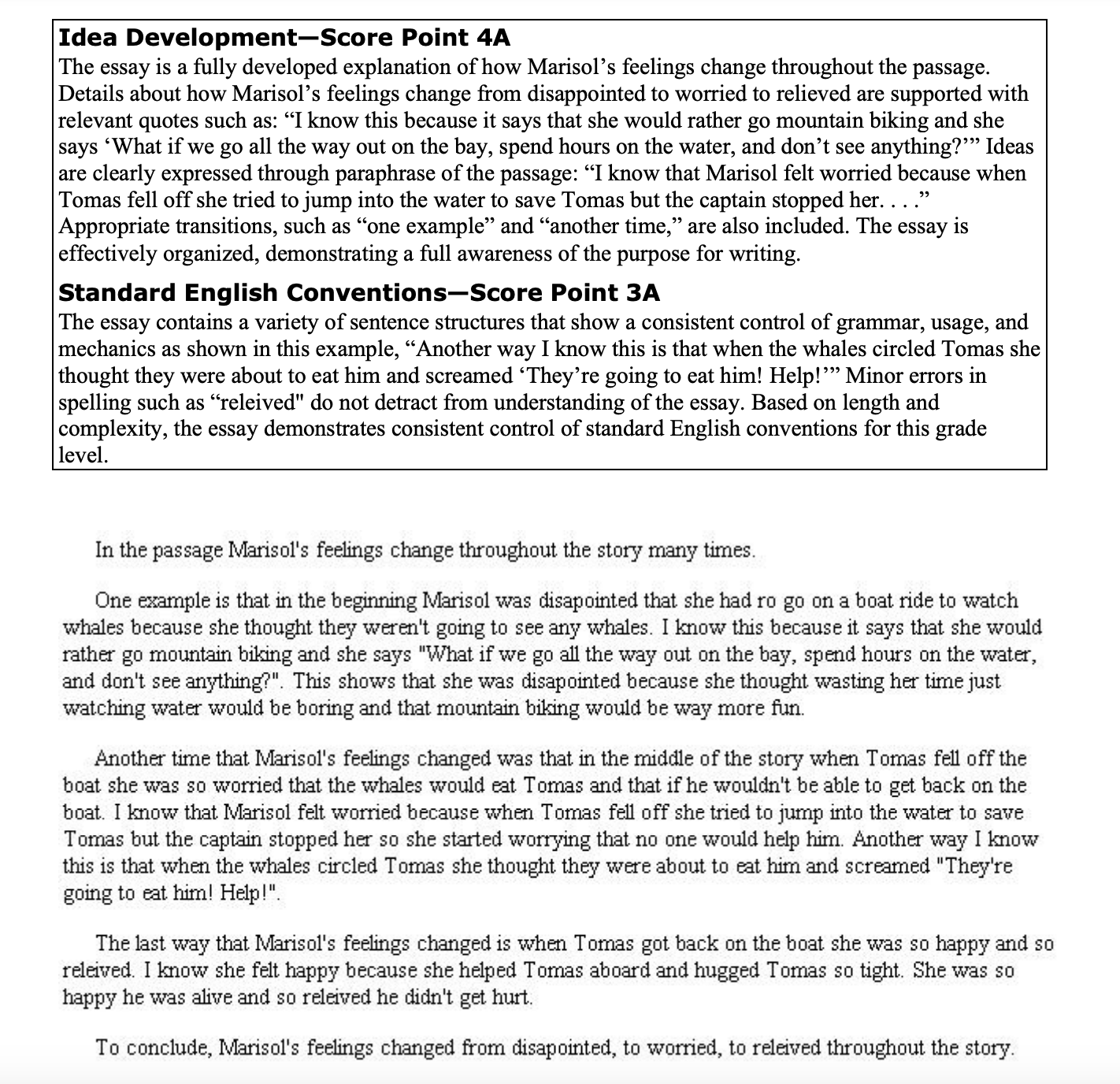 - Textual Evidence: The student supplied details from the text in each paragraph either directly cited or paraphrased.
