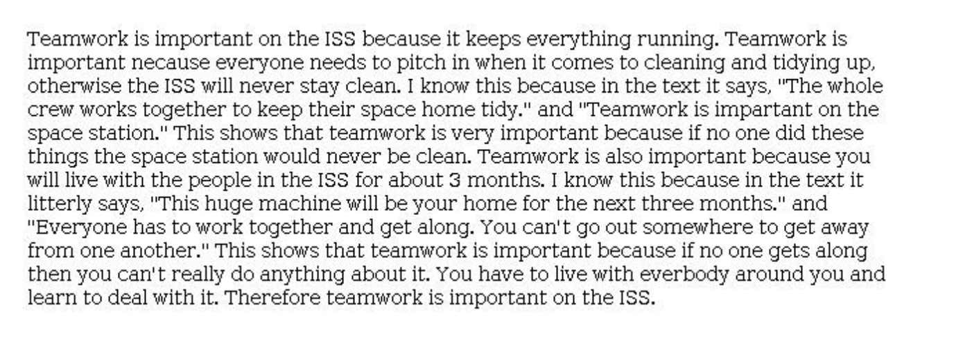 - I know this because in the text it says, “The whole crew works together to keep their space home tidy.” This shows that teamwork is very important because if no one did these things the space station would never be clean.