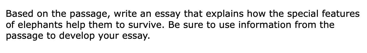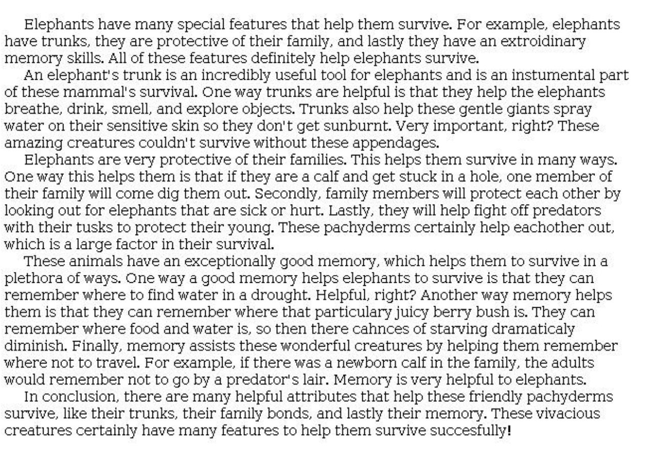 - Textual Evidence/Elaboration: Each paragraph includes evidence that is paraphrased directly from the text. The author chose the evidence and included the explanation of why this evidence is important. A skillful use of the detail generating questions, “What does it look like? And Why is it important?” “What does it look like when an elephant uses a feature and why is that important to the elephant’s survival?”