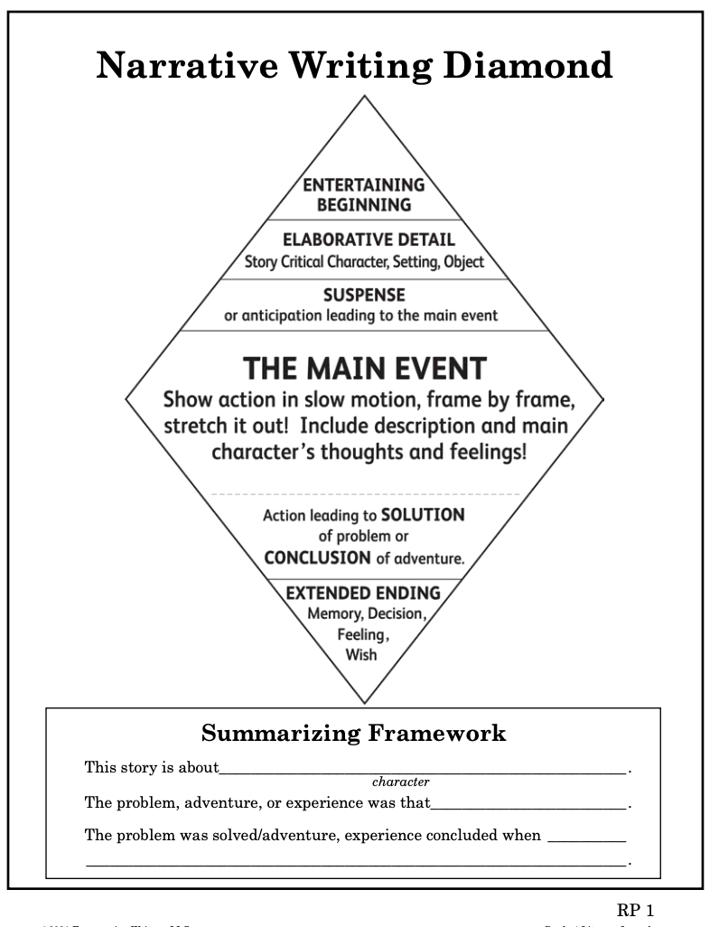How to teach it: A simple approach to teaching organization is introducing students to the narrative writing diamond.(this link includes the Annotation and Analysis Process - couldn’t find the diamond/summary standalone) The diamond represents the shape and narrative story takes and includes the specific skills authors use to fully elaborate their stories. It helps students visualize how the events in their stories should unfold, ensuring that the narrative has balance and progression, as well as story engagement. Along with the diamond, the narrative summarizing framework serves as a story map to use as a prewriting tool or graph.